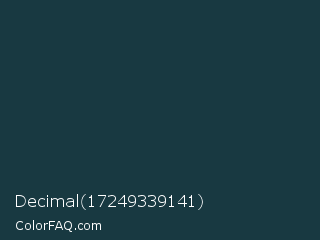 Decimal 17249339141 Color is a very dark cyan color and the nearest color is Elephant #123447. Hex code #183941 and RGB value is rgb(24,57,65). In RGB color space, this color is composed of 9% red, 22% green, 25% blue, In CMYK color space, this color is composed of 63% cyan, 12% magenta, 0% yellow , 75% black , In HSL color space, this color has a hue angle of 192° , 46% saturation and 17% lightness.