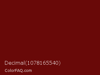 Decimal 1078165540 Color is a very dark red color and the nearest color is Red Oxide #6e0902. Hex code #690908 and RGB value is rgb(105,9,8). In RGB color space, this color is composed of 41% red, 4% green, 3% blue, In CMYK color space, this color is composed of 0% cyan, 91% magenta, 92% yellow , 59% black , In HSL color space, this color has a hue angle of 1° , 86% saturation and 22% lightness.