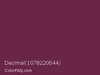 Decimal 1078220644 Color is a dark rose color and the nearest color is Tawny Port #692545. Hex code #692744 and RGB value is rgb(105,39,68). In RGB color space, this color is composed of 41% red, 15% green, 27% blue, In CMYK color space, this color is composed of 0% cyan, 63% magenta, 35% yellow , 59% black , In HSL color space, this color has a hue angle of 334° , 46% saturation and 28% lightness.