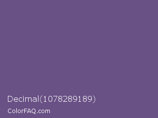 Decimal 1078289189 Color is a normal violet color and the nearest color is Affair #714693. Hex code #695085 and RGB value is rgb(105,80,133). In RGB color space, this color is composed of 41% red, 31% green, 52% blue, In CMYK color space, this color is composed of 21% cyan, 40% magenta, 0% yellow , 48% black , In HSL color space, this color has a hue angle of 268° , 25% saturation and 42% lightness.