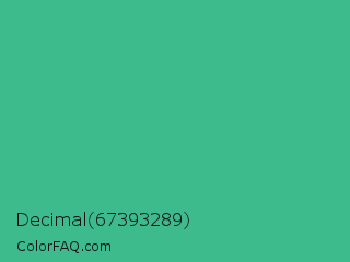 Decimal 67393289 Color is a normal green color and the nearest color is Mint #3eb489. Hex code #3dbb8d and RGB value is rgb(61,187,141). In RGB color space, this color is composed of 24% red, 73% green, 55% blue, In CMYK color space, this color is composed of 67% cyan, 0% magenta, 25% yellow , 27% black , In HSL color space, this color has a hue angle of 158° , 51% saturation and 49% lightness.