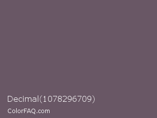 Decimal 1078296709 Color is a normal magenta color and the nearest color is Scorpion #695f62. Hex code #695765 and RGB value is rgb(105,87,101). In RGB color space, this color is composed of 41% red, 34% green, 40% blue, In CMYK color space, this color is composed of 0% cyan, 17% magenta, 4% yellow , 59% black , In HSL color space, this color has a hue angle of 313° , 9% saturation and 38% lightness.
