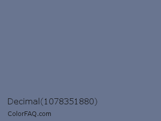 Decimal 1078351880 Color is a normal blue color and the nearest color is Storm Gray #717486. Hex code #697590 and RGB value is rgb(105,117,144). In RGB color space, this color is composed of 41% red, 46% green, 56% blue, In CMYK color space, this color is composed of 27% cyan, 19% magenta, 0% yellow , 44% black , In HSL color space, this color has a hue angle of 222° , 16% saturation and 49% lightness.