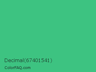 Decimal 67401541 Color is a normal green color and the nearest color is Mint #3eb489. Hex code #3dc381 and RGB value is rgb(61,195,129). In RGB color space, this color is composed of 24% red, 76% green, 51% blue, In CMYK color space, this color is composed of 69% cyan, 0% magenta, 34% yellow , 24% black , In HSL color space, this color has a hue angle of 150° , 53% saturation and 50% lightness.