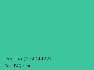 Decimal 67404422 Color is a normal green color and the nearest color is Puerto Rico #3fc1aa. Hex code #3dc59e and RGB value is rgb(61,197,158). In RGB color space, this color is composed of 24% red, 77% green, 62% blue, In CMYK color space, this color is composed of 69% cyan, 0% magenta, 20% yellow , 23% black , In HSL color space, this color has a hue angle of 163° , 54% saturation and 51% lightness.