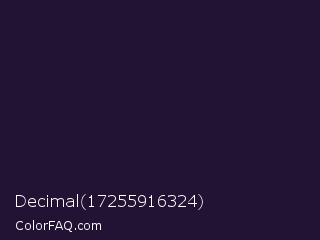 Decimal 17255916324 Color is a very dark violet color and the nearest color is Haiti #1b1035. Hex code #221334 and RGB value is rgb(34,19,52). In RGB color space, this color is composed of 13% red, 7% green, 20% blue, In CMYK color space, this color is composed of 35% cyan, 63% magenta, 0% yellow , 80% black , In HSL color space, this color has a hue angle of 267° , 46% saturation and 14% lightness.
