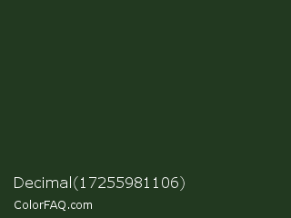 Decimal 17255981106 Color is a very dark green color and the nearest color is Green Kelp #25311c. Hex code #223920 and RGB value is rgb(34,57,32). In RGB color space, this color is composed of 13% red, 22% green, 13% blue, In CMYK color space, this color is composed of 40% cyan, 0% magenta, 44% yellow , 78% black , In HSL color space, this color has a hue angle of 115° , 28% saturation and 17% lightness.