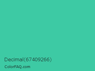 Decimal 67409266 Color is a normal cyan color and the nearest color is Puerto Rico #3fc1aa. Hex code #3dcaa4 and RGB value is rgb(61,202,164). In RGB color space, this color is composed of 24% red, 79% green, 64% blue, In CMYK color space, this color is composed of 70% cyan, 0% magenta, 19% yellow , 21% black , In HSL color space, this color has a hue angle of 164° , 57% saturation and 52% lightness.