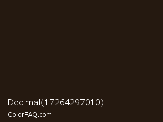Decimal 17264297010 Color is a very dark orange color and the nearest color is Eternity #211a0e. Hex code #251910 and RGB value is rgb(37,25,16). In RGB color space, this color is composed of 15% red, 10% green, 6% blue, In CMYK color space, this color is composed of 0% cyan, 32% magenta, 57% yellow , 85% black , In HSL color space, this color has a hue angle of 26° , 40% saturation and 10% lightness.