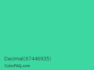 Decimal 67446935 Color is a normal green color and the nearest color is Eucalyptus #44d7a8. Hex code #3dd7a1 and RGB value is rgb(61,215,161). In RGB color space, this color is composed of 24% red, 84% green, 63% blue, In CMYK color space, this color is composed of 72% cyan, 0% magenta, 25% yellow , 16% black , In HSL color space, this color has a hue angle of 159° , 66% saturation and 54% lightness.