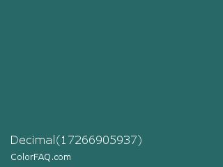 Decimal 17266905937 Color is a dark cyan color and the nearest color is Casal #2f6168. Hex code #286867 and RGB value is rgb(40,104,103). In RGB color space, this color is composed of 16% red, 41% green, 40% blue, In CMYK color space, this color is composed of 62% cyan, 0% magenta, 1% yellow , 59% black , In HSL color space, this color has a hue angle of 179° , 44% saturation and 28% lightness.