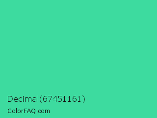 Decimal 67451161 Color is a normal green color and the nearest color is Eucalyptus #44d7a8. Hex code #3ddb9f and RGB value is rgb(61,219,159). In RGB color space, this color is composed of 24% red, 86% green, 62% blue, In CMYK color space, this color is composed of 72% cyan, 0% magenta, 27% yellow , 14% black , In HSL color space, this color has a hue angle of 157° , 69% saturation and 55% lightness.
