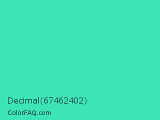 Decimal 67462402 Color is a normal green color and the nearest color is Eucalyptus #44d7a8. Hex code #3de5b6 and RGB value is rgb(61,229,182). In RGB color space, this color is composed of 24% red, 90% green, 71% blue, In CMYK color space, this color is composed of 73% cyan, 0% magenta, 21% yellow , 10% black , In HSL color space, this color has a hue angle of 163° , 76% saturation and 57% lightness.
