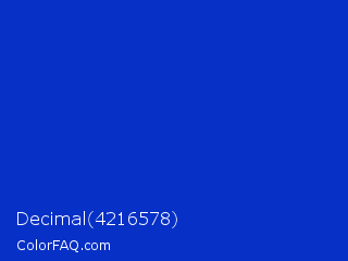 Decimal 4216578 Color is a normal blue color and the nearest color is Persian Blue #1c39bb. Hex code #0630c6 and RGB value is rgb(6,48,198). In RGB color space, this color is composed of 2% red, 19% green, 78% blue, In CMYK color space, this color is composed of 97% cyan, 76% magenta, 0% yellow , 22% black , In HSL color space, this color has a hue angle of 227° , 94% saturation and 40% lightness.