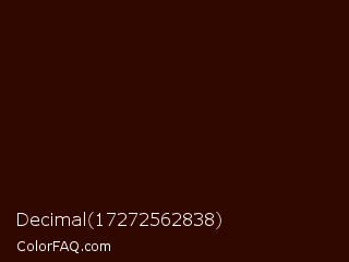 Decimal 17272562838 Color is a very dark red color and the nearest color is Chocolate #370202. Hex code #310800 and RGB value is rgb(49,8,0). In RGB color space, this color is composed of 19% red, 3% green, 0% blue, In CMYK color space, this color is composed of 0% cyan, 84% magenta, 100% yellow , 81% black , In HSL color space, this color has a hue angle of 10° , 100% saturation and 10% lightness.