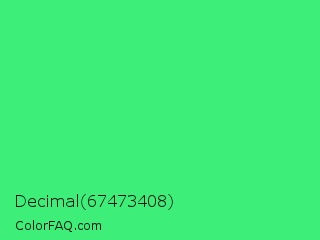 Decimal 67473408 Color is a normal green color and the nearest color is UFO Green #3cd070. Hex code #3def78 and RGB value is rgb(61,239,120). In RGB color space, this color is composed of 24% red, 94% green, 47% blue, In CMYK color space, this color is composed of 74% cyan, 0% magenta, 50% yellow , 6% black , In HSL color space, this color has a hue angle of 140° , 85% saturation and 59% lightness.