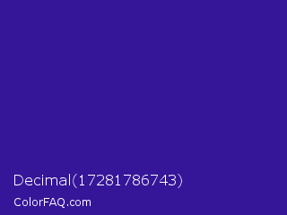 Decimal 17281786743 Color is a normal indigo color and the nearest color is Blue Gem #2c0e8c. Hex code #351699 and RGB value is rgb(53,22,153). In RGB color space, this color is composed of 21% red, 9% green, 60% blue, In CMYK color space, this color is composed of 65% cyan, 86% magenta, 0% yellow , 40% black , In HSL color space, this color has a hue angle of 254° , 75% saturation and 34% lightness.