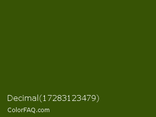 Decimal 17283123479 Color is a very dark green color and the nearest color is Clover #384910. Hex code #375305 and RGB value is rgb(55,83,5). In RGB color space, this color is composed of 22% red, 33% green, 2% blue, In CMYK color space, this color is composed of 34% cyan, 0% magenta, 94% yellow , 67% black , In HSL color space, this color has a hue angle of 82° , 89% saturation and 17% lightness.