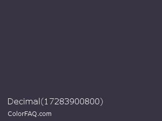 Decimal 17283900800 Color is a dark indigo color and the nearest color is Tuna #353542. Hex code #383444 and RGB value is rgb(56,52,68). In RGB color space, this color is composed of 22% red, 20% green, 27% blue, In CMYK color space, this color is composed of 18% cyan, 24% magenta, 0% yellow , 73% black , In HSL color space, this color has a hue angle of 255° , 13% saturation and 24% lightness.