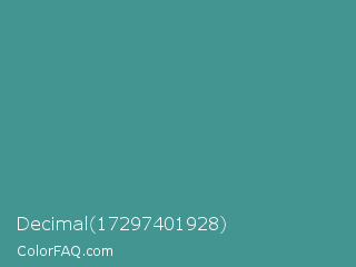 Decimal 17297401928 Color is a normal cyan color and the nearest color is Zomp #39a78e. Hex code #429590 and RGB value is rgb(66,149,144). In RGB color space, this color is composed of 26% red, 58% green, 56% blue, In CMYK color space, this color is composed of 56% cyan, 0% magenta, 3% yellow , 42% black , In HSL color space, this color has a hue angle of 176° , 39% saturation and 42% lightness.