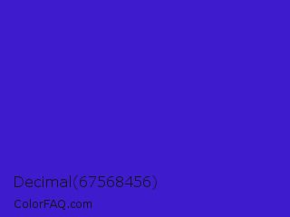 Decimal 67568456 Color is a normal indigo color and the nearest color is Interdimensional Blue #360ccc. Hex code #3e1bcc and RGB value is rgb(62,27,204). In RGB color space, this color is composed of 24% red, 11% green, 80% blue, In CMYK color space, this color is composed of 70% cyan, 87% magenta, 0% yellow , 20% black , In HSL color space, this color has a hue angle of 252° , 77% saturation and 45% lightness.
