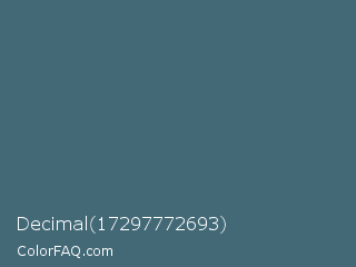 Decimal 17297772693 Color is a normal blue color and the nearest color is Blue Bayoux #496679. Hex code #436977 and RGB value is rgb(67,105,119). In RGB color space, this color is composed of 26% red, 41% green, 47% blue, In CMYK color space, this color is composed of 44% cyan, 12% magenta, 0% yellow , 53% black , In HSL color space, this color has a hue angle of 196° , 28% saturation and 36% lightness.