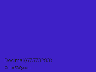 Decimal 67573283 Color is a normal indigo color and the nearest color is Interdimensional Blue #360ccc. Hex code #3e20c7 and RGB value is rgb(62,32,199). In RGB color space, this color is composed of 24% red, 13% green, 78% blue, In CMYK color space, this color is composed of 69% cyan, 84% magenta, 0% yellow , 22% black , In HSL color space, this color has a hue angle of 251° , 72% saturation and 45% lightness.