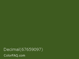 Decimal 67659097 Color is a dark green color and the nearest color is Dark Moss Green #4a5d23. Hex code #3e5b1f and RGB value is rgb(62,91,31). In RGB color space, this color is composed of 24% red, 36% green, 12% blue, In CMYK color space, this color is composed of 32% cyan, 0% magenta, 66% yellow , 64% black , In HSL color space, this color has a hue angle of 89° , 49% saturation and 24% lightness.