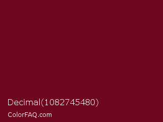 Decimal 1082745480 Color is a dark red color and the nearest color is Black Rose #67032d. Hex code #700720 and RGB value is rgb(112,7,32). In RGB color space, this color is composed of 44% red, 3% green, 13% blue, In CMYK color space, this color is composed of 0% cyan, 94% magenta, 71% yellow , 56% black , In HSL color space, this color has a hue angle of 346° , 88% saturation and 23% lightness.