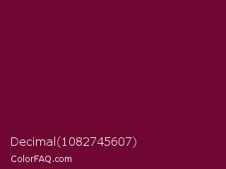 Decimal 1082745607 Color is a dark rose color and the nearest color is Black Rose #67032d. Hex code #700733 and RGB value is rgb(112,7,51). In RGB color space, this color is composed of 44% red, 3% green, 20% blue, In CMYK color space, this color is composed of 0% cyan, 94% magenta, 54% yellow , 56% black , In HSL color space, this color has a hue angle of 335° , 88% saturation and 23% lightness.