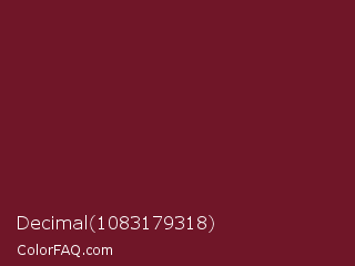 Decimal 1083179318 Color is a dark red color and the nearest color is Persian Plum #701c1c. Hex code #701628 and RGB value is rgb(112,22,40). In RGB color space, this color is composed of 44% red, 9% green, 16% blue, In CMYK color space, this color is composed of 0% cyan, 80% magenta, 64% yellow , 56% black , In HSL color space, this color has a hue angle of 348° , 67% saturation and 26% lightness.