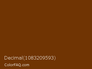 Decimal 1083209593 Color is a dark orange color and the nearest color is Nutmeg Wood Finish #683600. Hex code #703403 and RGB value is rgb(112,52,3). In RGB color space, this color is composed of 44% red, 20% green, 1% blue, In CMYK color space, this color is composed of 0% cyan, 54% magenta, 97% yellow , 56% black , In HSL color space, this color has a hue angle of 27° , 95% saturation and 23% lightness.