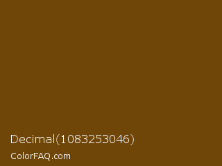 Decimal 1083253046 Color is a dark orange color and the nearest color is Cafe Royale #6f440c. Hex code #704508 and RGB value is rgb(112,69,8). In RGB color space, this color is composed of 44% red, 27% green, 3% blue, In CMYK color space, this color is composed of 0% cyan, 38% magenta, 93% yellow , 56% black , In HSL color space, this color has a hue angle of 35° , 87% saturation and 24% lightness.