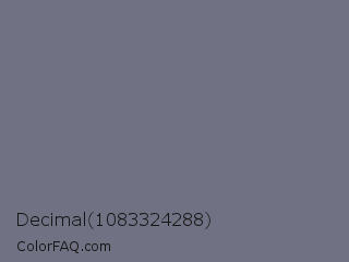 Decimal 1083324288 Color is a normal blue color and the nearest color is Storm Gray #717486. Hex code #707284 and RGB value is rgb(112,114,132). In RGB color space, this color is composed of 44% red, 45% green, 52% blue, In CMYK color space, this color is composed of 15% cyan, 14% magenta, 0% yellow , 48% black , In HSL color space, this color has a hue angle of 234° , 8% saturation and 48% lightness.