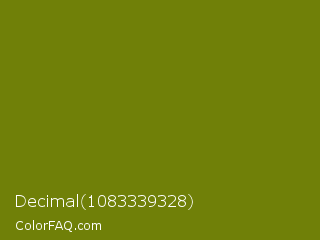 Decimal 1083339328 Color is a dark yellow color and the nearest color is Olive #808000. Hex code #708008 and RGB value is rgb(112,128,8). In RGB color space, this color is composed of 44% red, 50% green, 3% blue, In CMYK color space, this color is composed of 13% cyan, 0% magenta, 94% yellow , 50% black , In HSL color space, this color has a hue angle of 68° , 88% saturation and 27% lightness.