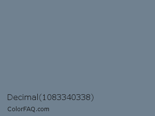 Decimal 1083340338 Color is a normal blue color and the nearest color is Slate Gray #708090. Hex code #708190 and RGB value is rgb(112,129,144). In RGB color space, this color is composed of 44% red, 51% green, 56% blue, In CMYK color space, this color is composed of 22% cyan, 10% magenta, 0% yellow , 44% black , In HSL color space, this color has a hue angle of 208° , 13% saturation and 50% lightness.