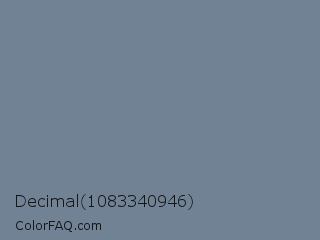 Decimal 1083340946 Color is a normal blue color and the nearest color is Slate Gray #708090. Hex code #708294 and RGB value is rgb(112,130,148). In RGB color space, this color is composed of 44% red, 51% green, 58% blue, In CMYK color space, this color is composed of 24% cyan, 12% magenta, 0% yellow , 42% black , In HSL color space, this color has a hue angle of 210° , 14% saturation and 51% lightness.