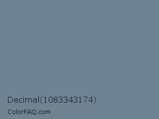 Decimal 1083343174 Color is a normal blue color and the nearest color is Slate Gray #708090. Hex code #708392 and RGB value is rgb(112,131,146). In RGB color space, this color is composed of 44% red, 51% green, 57% blue, In CMYK color space, this color is composed of 23% cyan, 10% magenta, 0% yellow , 43% black , In HSL color space, this color has a hue angle of 206° , 13% saturation and 51% lightness.