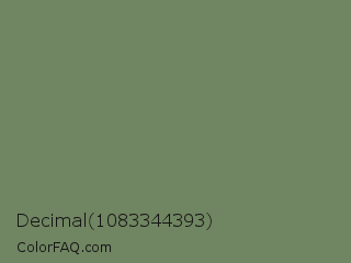 Decimal 1083344393 Color is a normal green color and the nearest color is Limed Ash #747d63. Hex code #708561 and RGB value is rgb(112,133,97). In RGB color space, this color is composed of 44% red, 52% green, 38% blue, In CMYK color space, this color is composed of 16% cyan, 0% magenta, 27% yellow , 48% black , In HSL color space, this color has a hue angle of 95° , 16% saturation and 45% lightness.