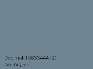 Decimal 1083344472 Color is a normal blue color and the nearest color is Slate Gray #708090. Hex code #708592 and RGB value is rgb(112,133,146). In RGB color space, this color is composed of 44% red, 52% green, 57% blue, In CMYK color space, this color is composed of 23% cyan, 9% magenta, 0% yellow , 43% black , In HSL color space, this color has a hue angle of 203° , 13% saturation and 51% lightness.