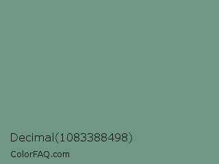 Decimal 1083388498 Color is a normal green color and the nearest color is Oxley #779e86. Hex code #709784 and RGB value is rgb(112,151,132). In RGB color space, this color is composed of 44% red, 59% green, 52% blue, In CMYK color space, this color is composed of 26% cyan, 0% magenta, 13% yellow , 41% black , In HSL color space, this color has a hue angle of 151° , 16% saturation and 52% lightness.