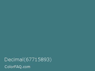 Decimal 67715893 Color is a normal cyan color and the nearest color is Faded Jade #427977. Hex code #3e797f and RGB value is rgb(62,121,127). In RGB color space, this color is composed of 24% red, 47% green, 50% blue, In CMYK color space, this color is composed of 51% cyan, 5% magenta, 0% yellow , 50% black , In HSL color space, this color has a hue angle of 186° , 34% saturation and 37% lightness.