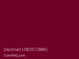 Decimal 1083572886 Color is a very dark rose color and the nearest color is Black Rose #67032d. Hex code #710128 and RGB value is rgb(113,1,40). In RGB color space, this color is composed of 44% red, 0% green, 16% blue, In CMYK color space, this color is composed of 0% cyan, 99% magenta, 65% yellow , 56% black , In HSL color space, this color has a hue angle of 339° , 98% saturation and 22% lightness.