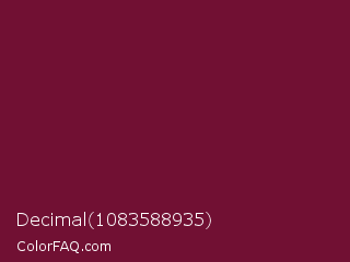 Decimal 1083588935 Color is a dark rose color and the nearest color is Claret #7f1734. Hex code #711033 and RGB value is rgb(113,16,51). In RGB color space, this color is composed of 44% red, 6% green, 20% blue, In CMYK color space, this color is composed of 0% cyan, 86% magenta, 55% yellow , 56% black , In HSL color space, this color has a hue angle of 338° , 75% saturation and 25% lightness.