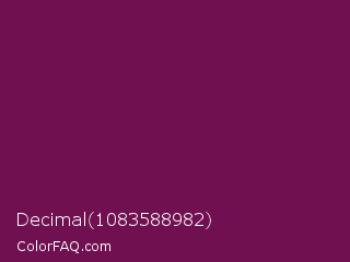 Decimal 1083588982 Color is a dark magenta color and the nearest color is Pansy Purple #78184a. Hex code #711050 and RGB value is rgb(113,16,80). In RGB color space, this color is composed of 44% red, 6% green, 31% blue, In CMYK color space, this color is composed of 0% cyan, 86% magenta, 29% yellow , 56% black , In HSL color space, this color has a hue angle of 320° , 75% saturation and 25% lightness.
