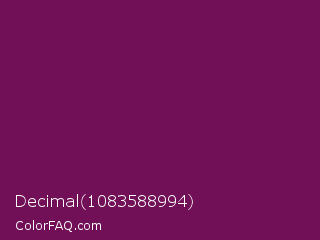 Decimal 1083588994 Color is a dark magenta color and the nearest color is Pansy Purple #78184a. Hex code #711056 and RGB value is rgb(113,16,86). In RGB color space, this color is composed of 44% red, 6% green, 34% blue, In CMYK color space, this color is composed of 0% cyan, 86% magenta, 24% yellow , 56% black , In HSL color space, this color has a hue angle of 317° , 75% saturation and 25% lightness.