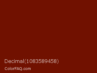 Decimal 1083589458 Color is a very dark red color and the nearest color is Dark Burgundy #770f05. Hex code #711100 and RGB value is rgb(113,17,0). In RGB color space, this color is composed of 44% red, 7% green, 0% blue, In CMYK color space, this color is composed of 0% cyan, 85% magenta, 100% yellow , 56% black , In HSL color space, this color has a hue angle of 9° , 100% saturation and 22% lightness.