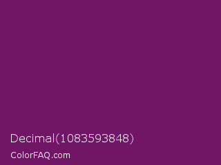 Decimal 1083593848 Color is a dark magenta color and the nearest color is Midnight #702670. Hex code #711566 and RGB value is rgb(113,21,102). In RGB color space, this color is composed of 44% red, 8% green, 40% blue, In CMYK color space, this color is composed of 0% cyan, 81% magenta, 10% yellow , 56% black , In HSL color space, this color has a hue angle of 307° , 69% saturation and 26% lightness.