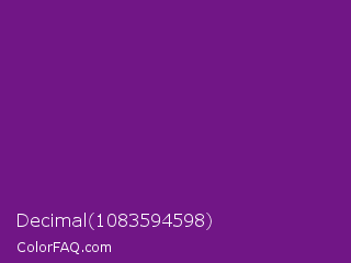 Decimal 1083594598 Color is a normal purple color and the nearest color is Seance #731e8f. Hex code #711686 and RGB value is rgb(113,22,134). In RGB color space, this color is composed of 44% red, 9% green, 53% blue, In CMYK color space, this color is composed of 16% cyan, 84% magenta, 0% yellow , 47% black , In HSL color space, this color has a hue angle of 289° , 72% saturation and 31% lightness.