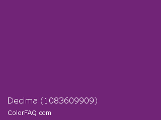 Decimal 1083609909 Color is a dark magenta color and the nearest color is Midnight #702670. Hex code #712477 and RGB value is rgb(113,36,119). In RGB color space, this color is composed of 44% red, 14% green, 47% blue, In CMYK color space, this color is composed of 5% cyan, 70% magenta, 0% yellow , 53% black , In HSL color space, this color has a hue angle of 296° , 54% saturation and 30% lightness.